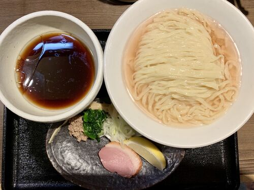 鴨出汁にこだわるyoshiki。いつも濃厚系を喰っていたので、今回は淡麗系に挑戦。 鴨出汁手揉み醤油つけ麺(900円)+中盛(100円)。 仕様の解説は、下記↓参照。 スープ。鴨出汁とカエシのバランスが最高。 怪しいピンク色の昆布水に浸かったツルツルモチモチ…