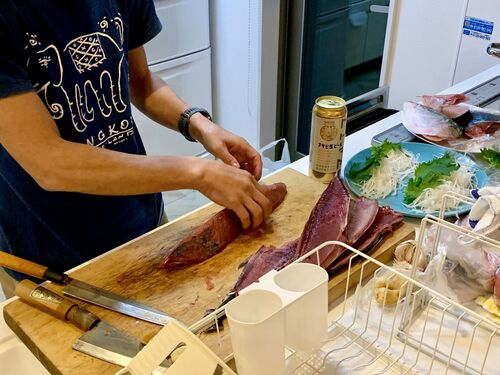 昨年に続き今年もプロ級の板前技術を有する定吉を招聘し貸別荘で忘年会。 色々ありまして日が沈んでから到着。 日本酒の仕入れは梅◯担当。上々だ。 さぁ始めるか。 カウンターに腰掛けると、自宅で仕込んで来た三魚種混合のなめろうをスッと出してくれた定吉…