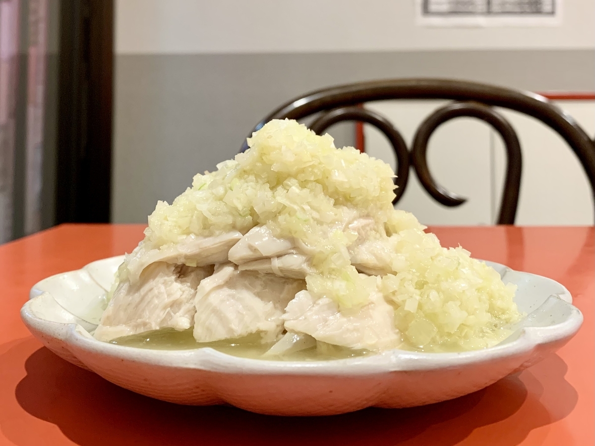 蒸し鶏の葱ソース。円やか過ぎる葱ソースが秀逸。超強烈に美味い。