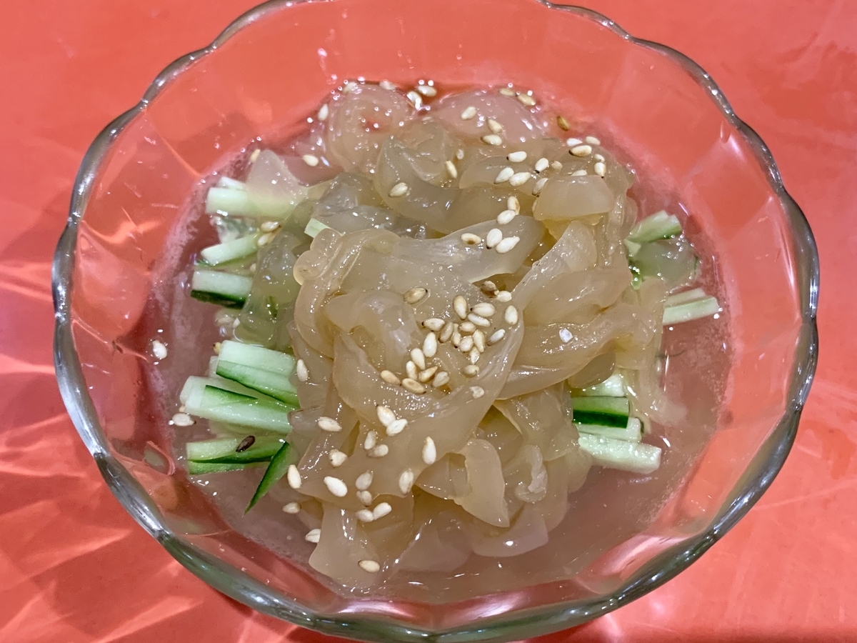 クラゲとキュウリの和え。酢の味が秀逸。強烈に美味い。