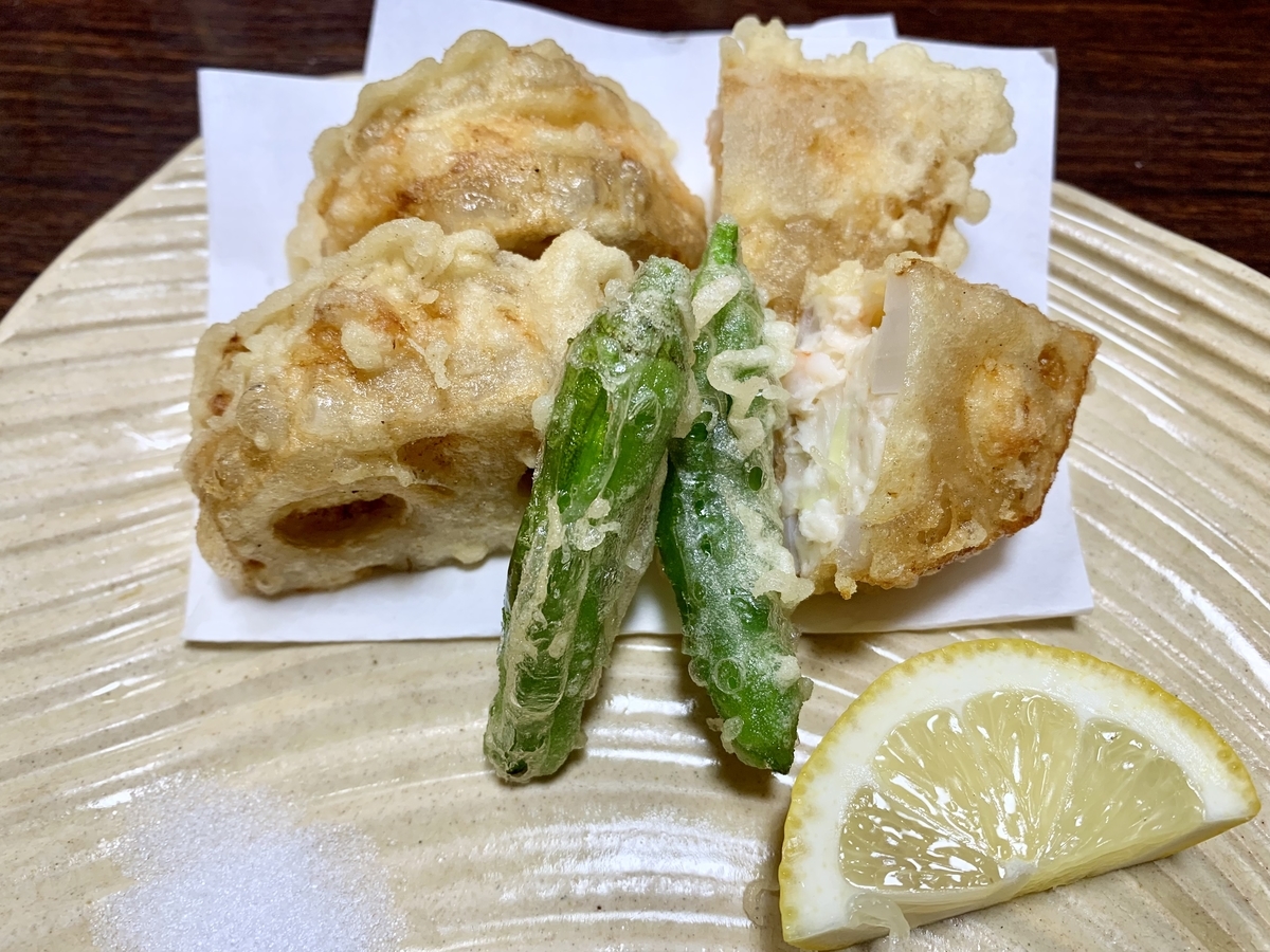 レンコン挟み揚げ。レンコン好きのオレとしては外せない品。海老しんじょうの旨味がたまらない。猛烈に美味い。