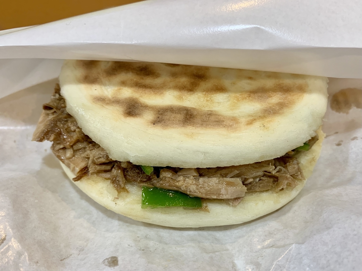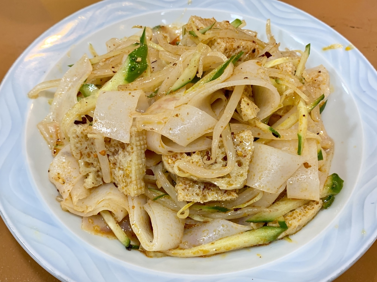 2022-11-23 東京 亀戸「亀戸刀削麺」 西安涼皮 中華 らーめん 前回の訪問時に、隣の客が美味そうに喰っていた西安涼皮とロージャモウセット(1,000円)が気になり再訪。 ロージャモウ。薄味のコンビーフみたいな肉を温かいパンに挟んだヤツ。オレ以外は店内全員中国人の完全アウェイ状態で喰うと文句無く美味く感じる。 西安涼皮。冷たい涼皮、きゅうり、もやし、色々な調味料が渾然一体となって一つの味を作り上げている。強烈に美味い。コレは夏に喰うと猛烈かも。 現地感満載の店に大満足。