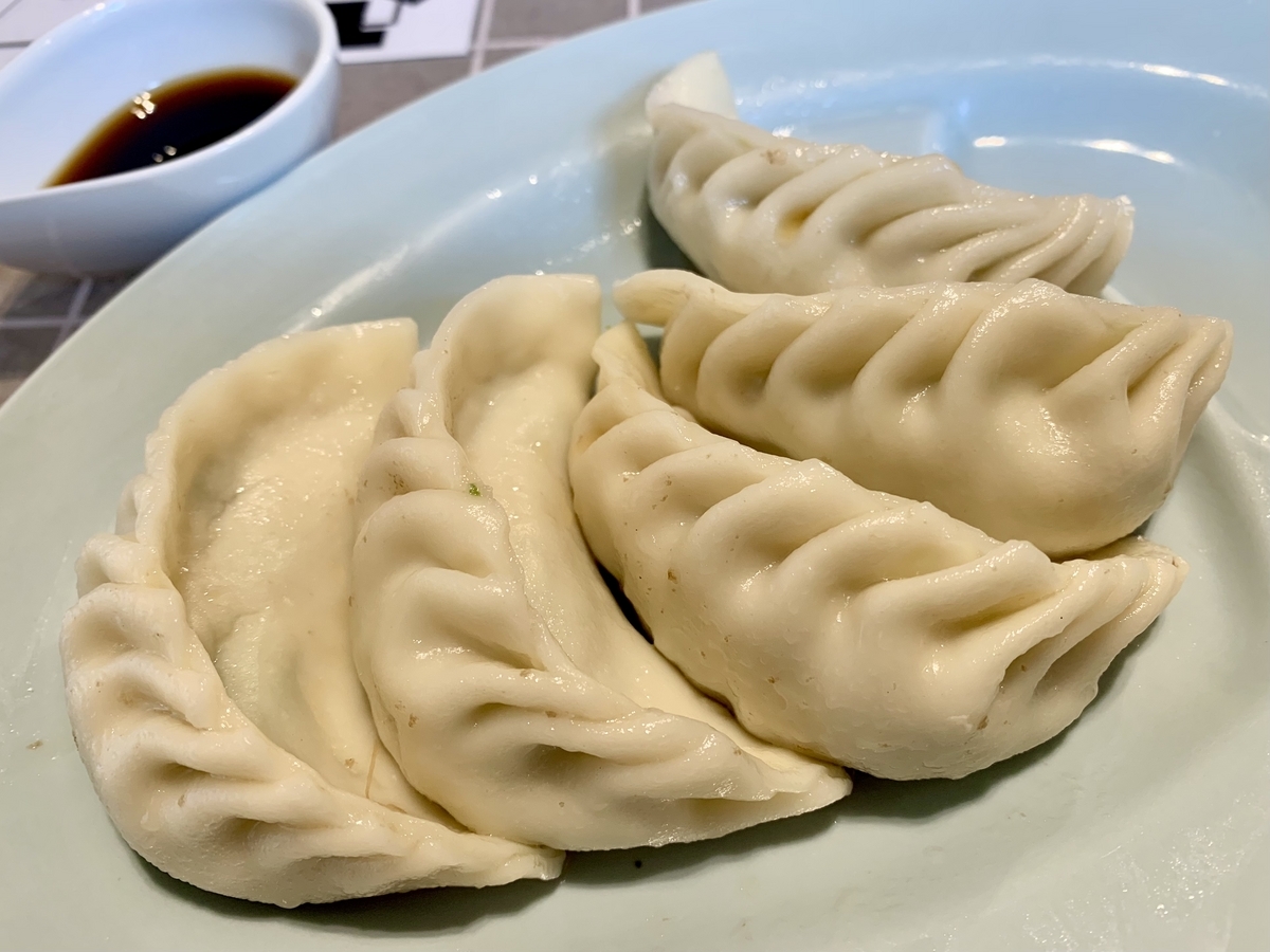 水餃子(550円)。ポン酢か胡麻ダレを選ぶ式。厚くてモチモチの皮と優しくも骨格を感じる餡の組み合わせが最高。強烈に美味い。