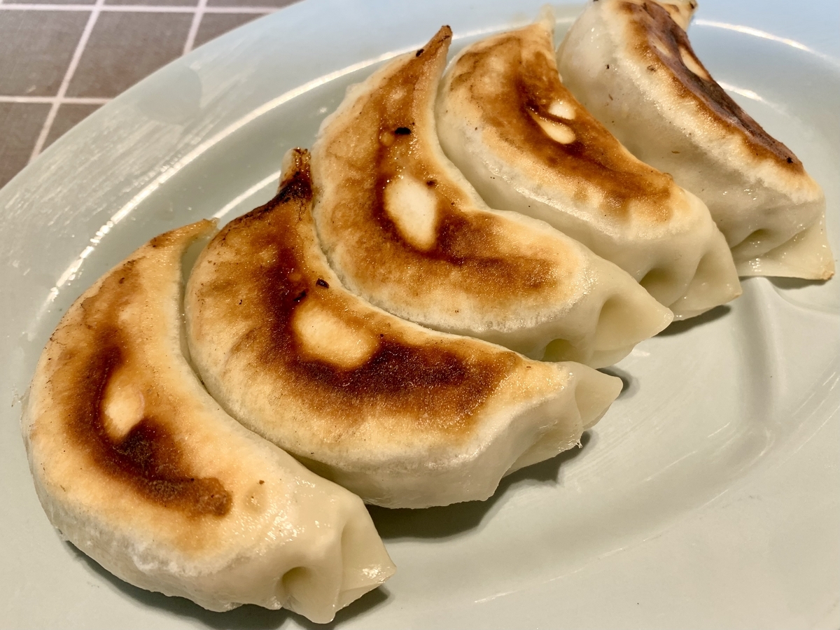 焼き餃子(550円)。水餃子と同じ皮を使っている様子。焼き餃子には珍しく厚い皮なのに全く喰い疲れない。強烈に美味い。