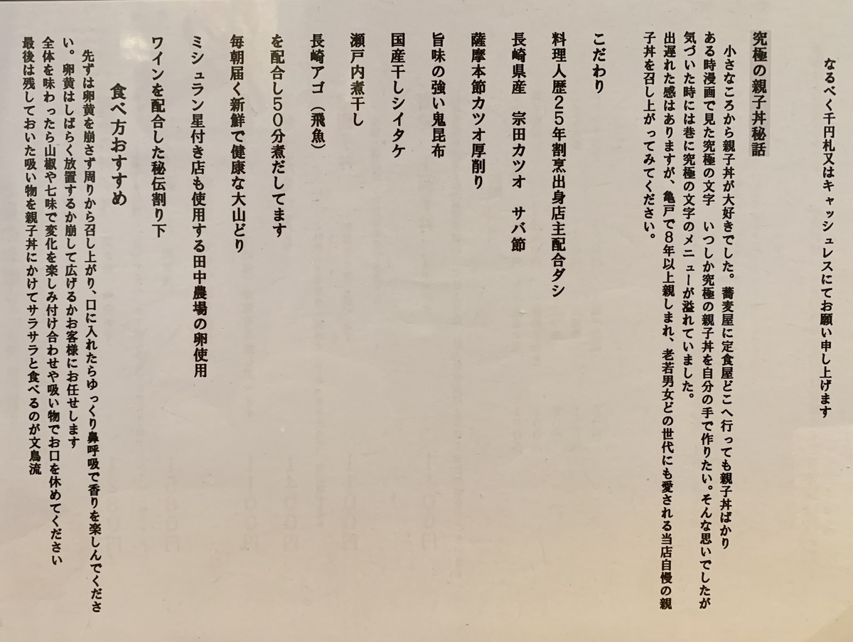 ↓親子丼にかける想いとかこだわりとか。使う出汁素材の種類が多くて喧嘩しそう。
